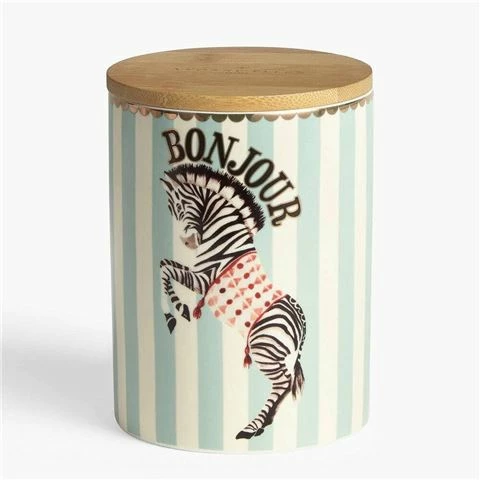 A fine china kitchen storage jar featuring a striped design and an Yvonne Ellen zebra illustration. The bamboo lid fits neatly on the canister, making the Zebra Storage Jar airtight and suitable for storing dried foods, coffee, tea or sugar.